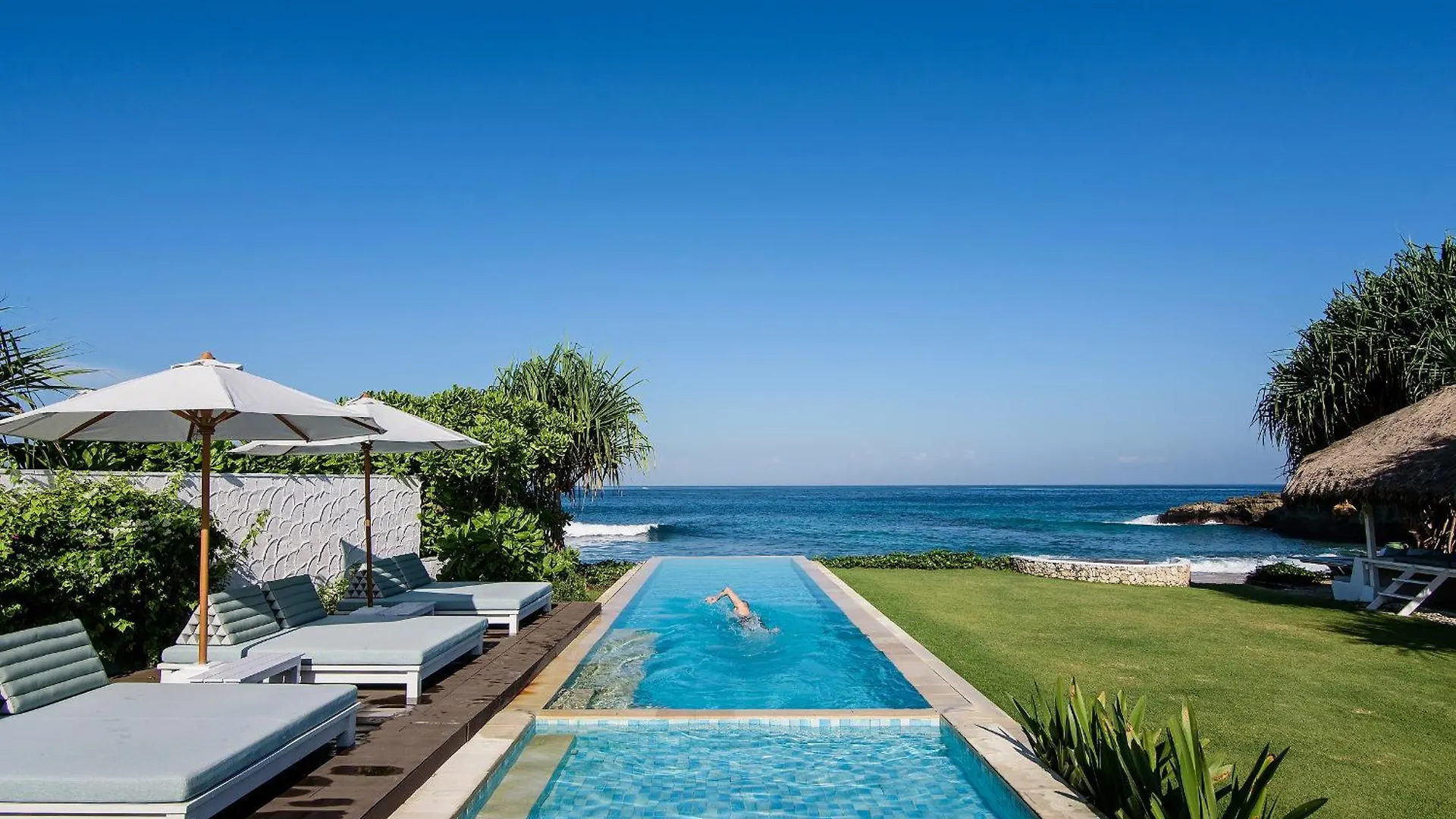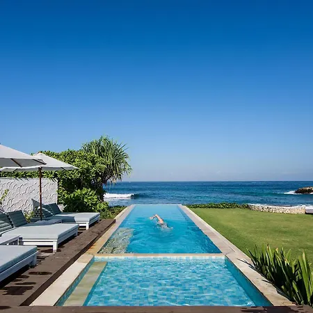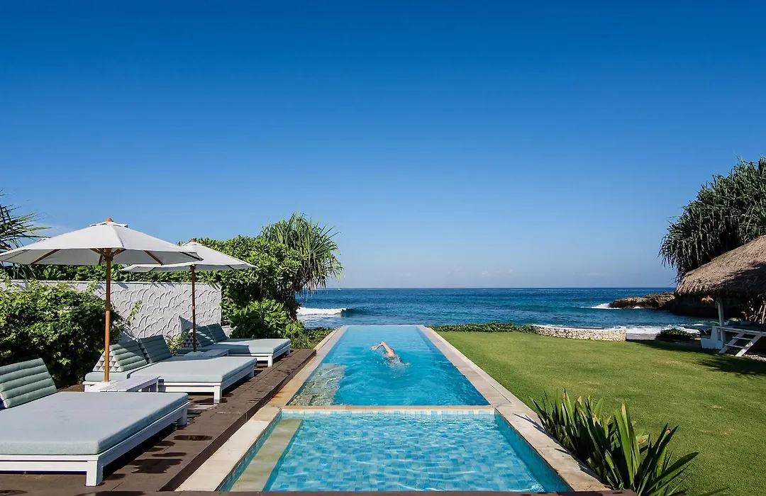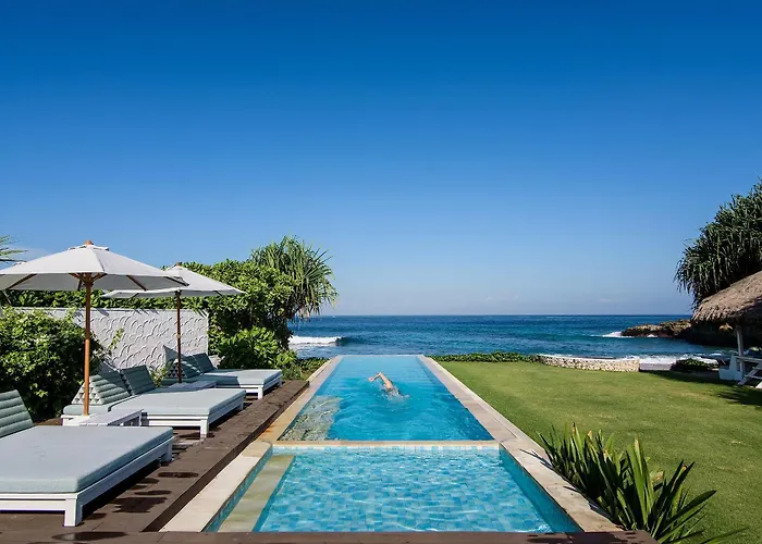 The 4-bathroom villa is nestled in the Jungut Batu district, 2.8 miles from Gamat bay. At a distance of 1.6 miles, you can visit Nusa Ceningan Island along with Devil's Tears located nearby 8 minutes' walk away.